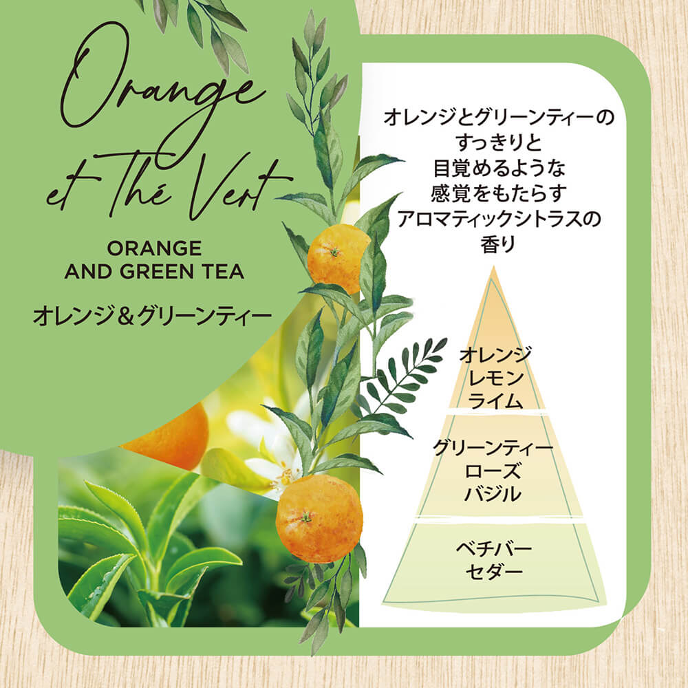 향기의 특성 오렌지와 녹차의 상쾌하고 깨어 난 감각을 가져다주는 방향족 감귤 향